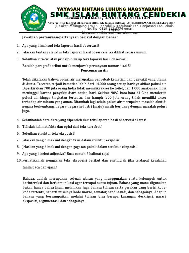 See full list on gurupendidikan.co.id Baca juga artikel yang mungkin berhubungan : contoh pamflet Kegiatan memiliki banyak manfaat diantaranya adalah untuk : Ditulis secara lengkap dan sempurna. Kelebihan dari jenis ini adalah peneliti menjadi bagian integral dari berbagai situasi yang dipelajari dilapangan, sehingga kehadirannya pun tidak mempengaruhi situasi di lapangan. Kronologi peristiwa dapat dicatat dengan runtut. Apakah laporan observasi secara umum terdiri dari:? Bagaimana cara membuat laporan hasil observasi? Jan 30, 2021 · teks laporan hasil observasi adalah teks yang berisi penjabaran umum atau melaporkan sesuatu berupa hasil dari pengamatan (observasi). Hasil observasi yang dibuat dapat dikonfirmasikan dengan hasil penelitian. Observasi pastisipasi merupakan observasi dimana peneliti atau observer ikut terlibat langsung dalam kegiatan pengamatan di lapangan. Objek yang akan dibicarakan atau dibahas adalah objek tunggal. Menggambarkan ciri, bentuk, atau sifat umum seperti benda, hewan.